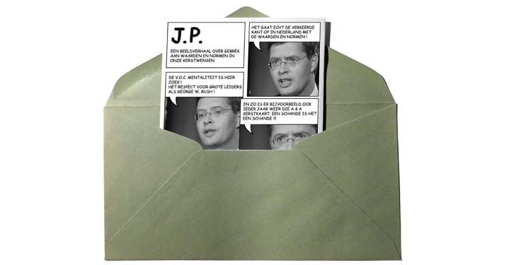 J.P. ergert zich aan het gebrek aan waarden en normen wanneer hij de A & A kerstkaart ziet.